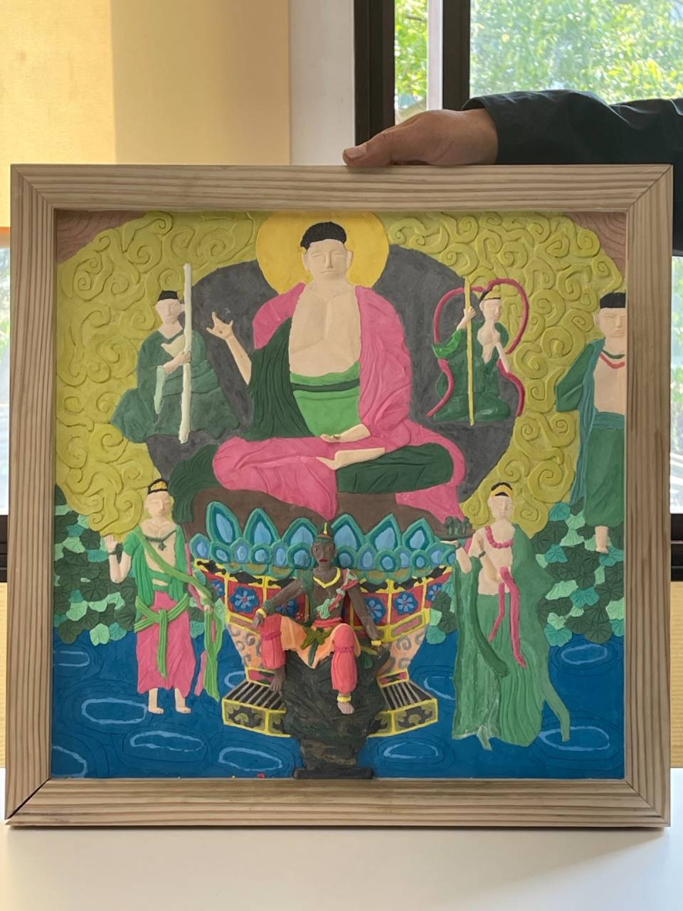 社長の作品 2025/05/29 第60回日左連青年部定期総会「左官展覧会」に出展した社長の作品です✨ 静かな佇まいと細やかな造形が特徴の水月観音像🪷 彩色や構図に工夫が凝らされており、落ち着いた雰囲気が感じられる仕上がりです。 水月観音像の存在感と、周囲の人物や装飾とのバランスが印象的です。